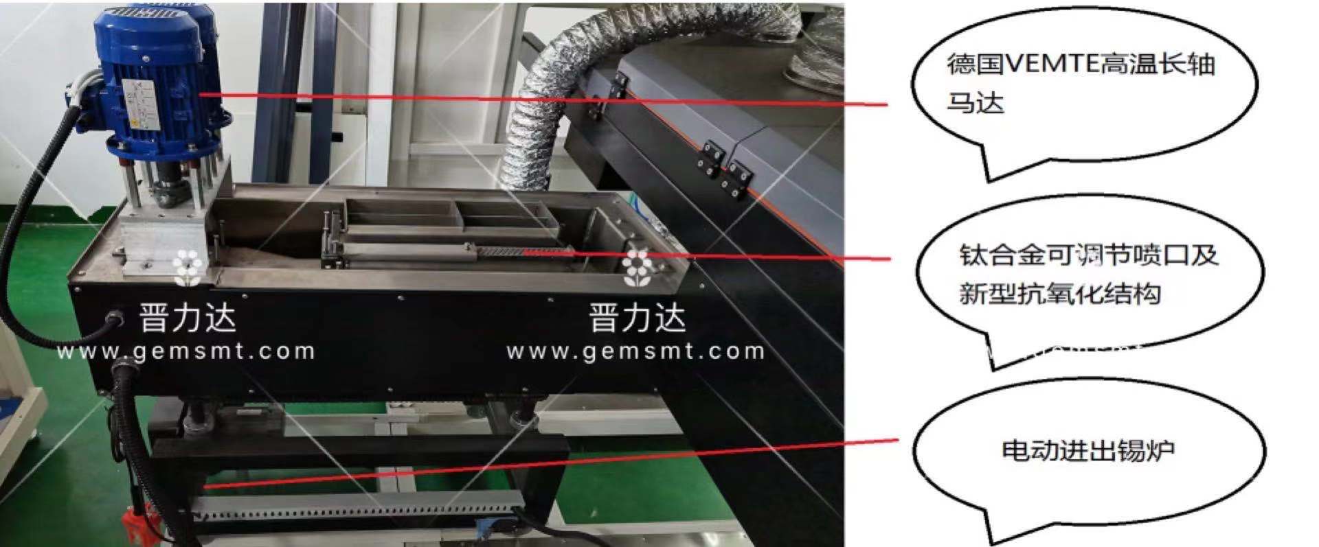 3、整體錫爐為自動進出裝置,減少維護工作時間,減少技術人員的工作量。對比同行手搖式進出錫爐更易操作,省力省時。