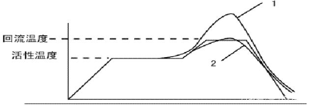 圖7中曲線1所不的溫度曲線表明回流溫度過咼,易造成PCB以及兀器件損傷,應降低回流區溫度,而曲線2所示的溫度表明回流溫度過低。此時焊料雖已熔化,但流動性差。焊料不能充分潤濕,故易引起虛焊或冷焊。