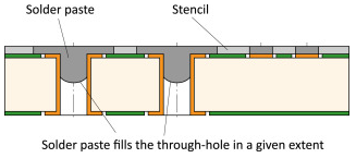 通孔回流技術對印刷過程的參數設定和錫膏質量有很高要求。然而鍍通孔內部的錫膏填充狀況無法通過SPI錫膏檢測儀器直觀檢測,只能通過X-RAY觀察。缺乏對通孔填充率進行全面在線檢查的是通孔回流焊的推廣較慢的原因之一。錫膏量很大程度決定了填充率。但由于引腳和回流參數變化,生成的焊點體積大多通過估算確定而非精確計算。為了盡可能保證鍍通孔處的錫膏量充足,可以采用階梯式印刷鋼網。這種階梯技術可以選擇性在鋼網某個區域增加或減小厚度,達到控制特定區域錫膏量的作用。最佳的印刷速度和印刷角度往往需要通過數值建模來進行分析。此外,錫膏的配方決定了潤濕性,如果潤濕性差,就很難以通過毛細作用對鍍通孔進行填充。