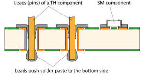 在把錫膏順利印刷到鍍通孔后,自動放置機會拾取通孔插裝元件插入通孔中。通孔元件的引腳撕裂鍍通孔中的錫膏,并將一部分錫膏膏推到底部。底部的錫膏在回流熔融時會通過毛細作用流回鍍通孔中,從而完全填充鍍通孔內部。