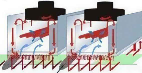 風葉熱風加熱結構的穿透力不足,而風輪增壓式熱風結構正是為解決這個問題誕生的回流焊增壓熱風結構的核心原理是通過強制高壓氣流穿透高元件陰影區,解決傳統熱風爐的熱傳遞不均勻問題。