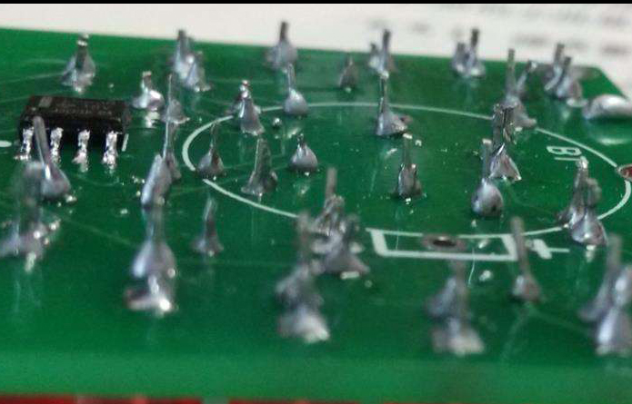 拉尖大多發(fā)生在PCB銅箔電路的終端。PCB經過波峰時,PCB上的液態(tài)料下墜受到限制時就會出現(xiàn)此現(xiàn)象。在高頻、高壓電路中,尤其需要注意此類缺陷的危害。