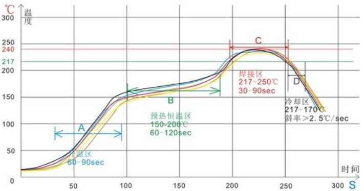 1,分析曲線:首先拿到客戶要求的曲線圖,如果沒有需參照錫膏供應(yīng)商提供的曲線圖,然后分析其溫度曲線升溫區(qū),恒溫區(qū),焊接區(qū),冷卻區(qū)各個(gè)溫區(qū)的峰值及持續(xù)時(shí)間。